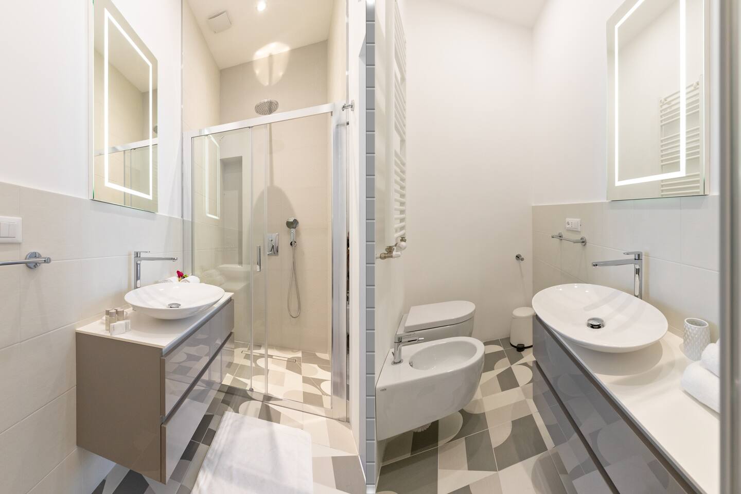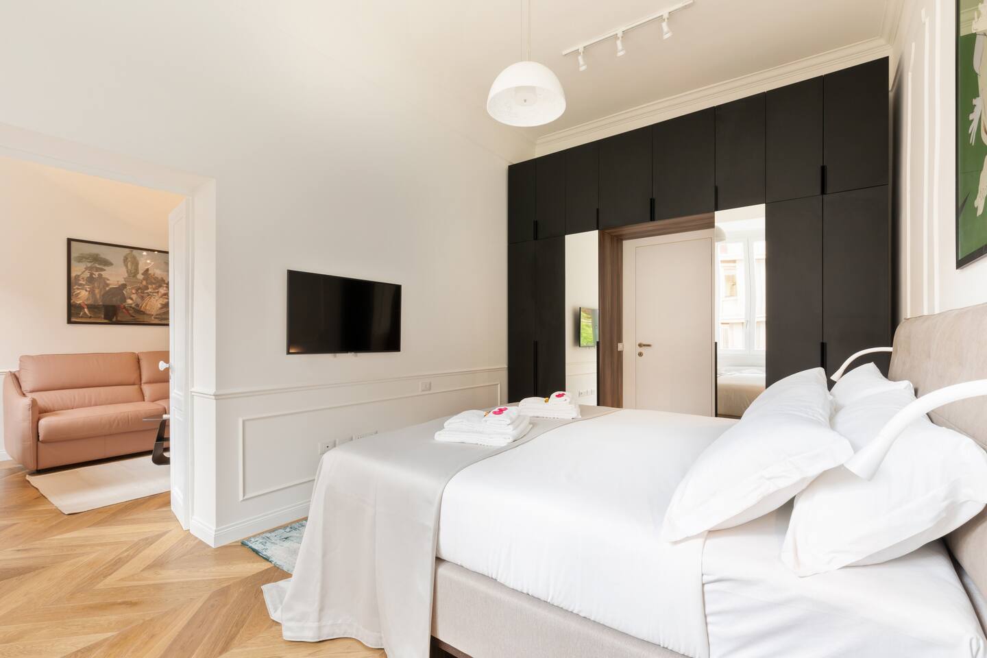 Discover a spacious and luminous living area, featuring a beautifully appointed living room with a comfortable king-size sofa bed seamlessly connected to a fully-equipped kitchen. The generously sized bedroom, featuring a king-sized bed, provides a stylish and inviting atmosphere along with ample storage space. Enjoy the convenience of two full bathrooms, ensuring no waiting in line for your comfort.Additionally, the living room sofa unfolds into a comfortable king-size bed. Enjoy a range of amenities including high-speed Wi-Fi, air conditioning in every room, heating, washer, dishwasher, and a fully-equipped kitchen, enhancing your stay in Rome with comfort and convenience.